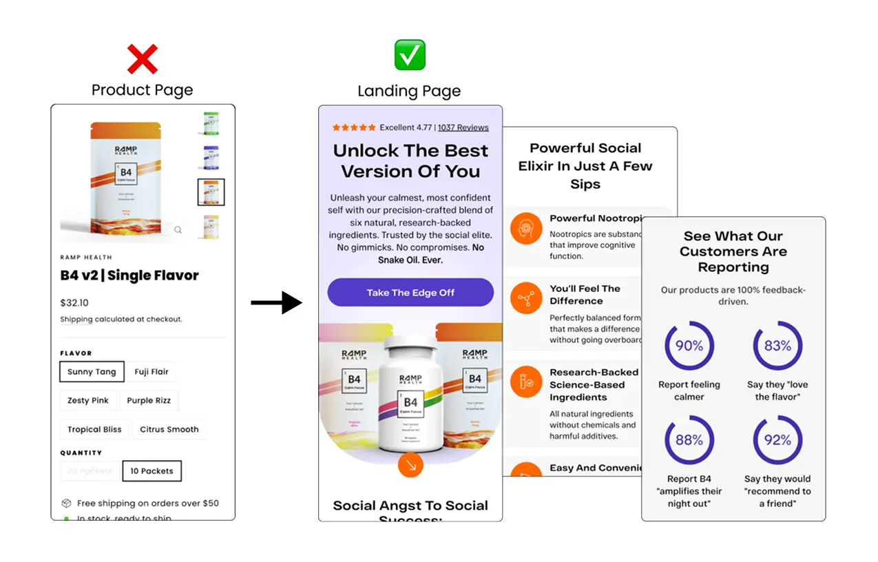 Scaling brands don’t send paid traffic to default PDPs. Cold visitors don’t just buy — they need to be sold. This kit gives you the landing page systems that doubled conversion rates for brands doing $500K–$10M.